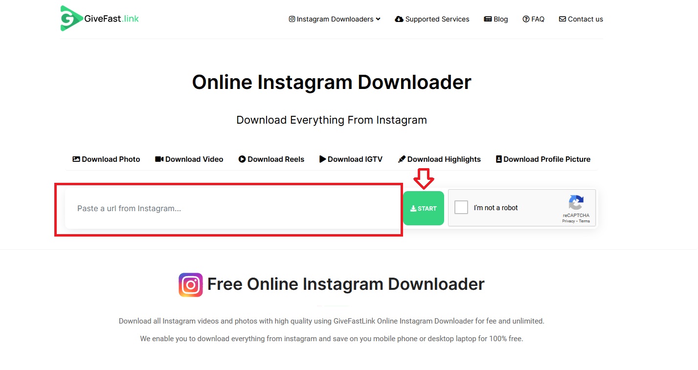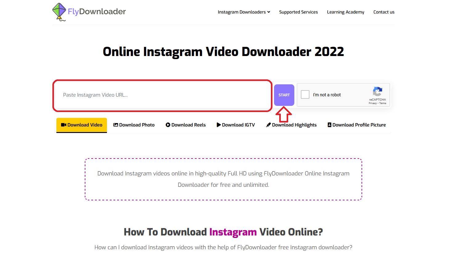 مرحله سوم: وقتی وارد صفحه دانلودر اینستا گیو شدید در کادری که مشخص است لینک ویدیو را که در مرحله اول کپی کرده بودید، جای گذاری کنید و سپس گزینه Start را بزنید.