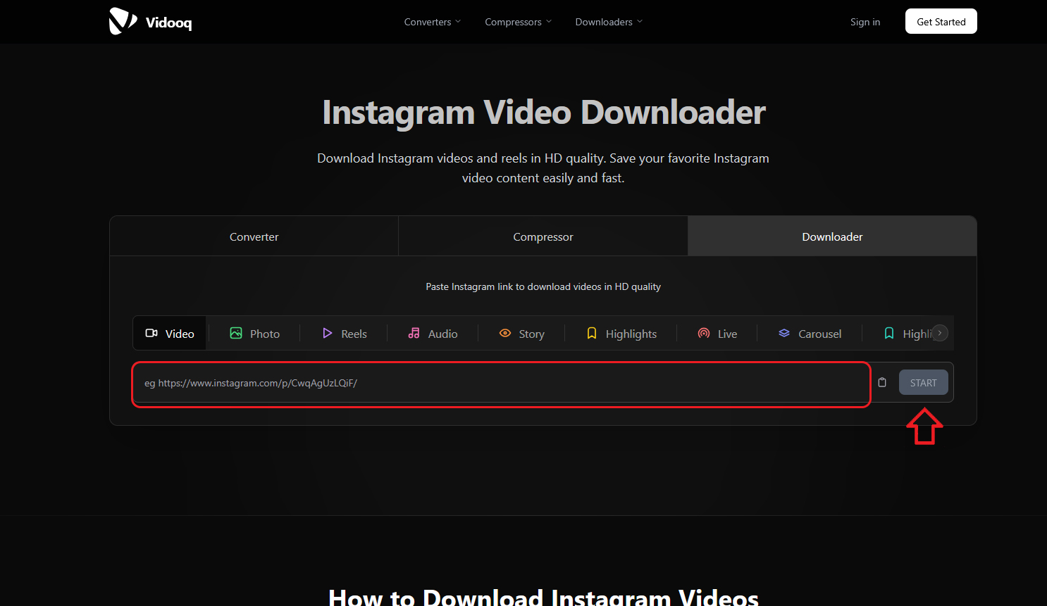 مرحله دوم: وارد سایت Vidooq شوید و در باکس مشخص لینک ویدیو را وارد کنید و روی گزینه Start بزنید.