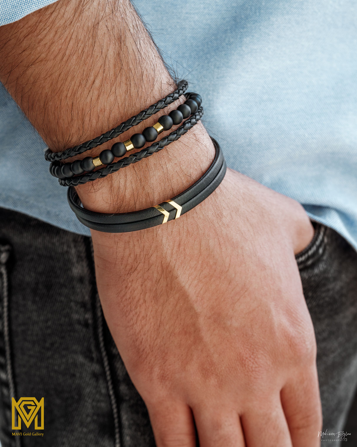 این گونه دستبندها ترکیبی از چرم و طلا و یکی از رایجترین و پرفروشترین دستبندهای مردانه است. این مدل دستبندها با لباس اسپرت و حتی لباس رسمی مردانه بسیار چشمگیر هستند.