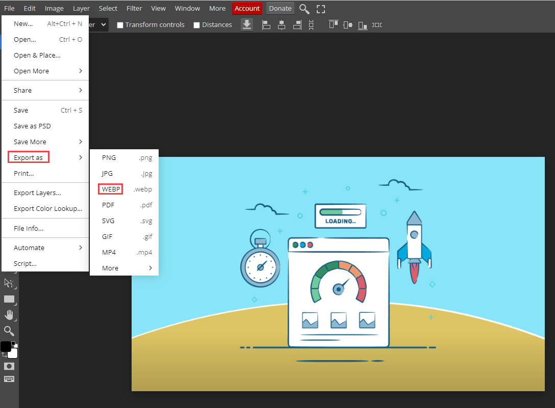 - سپس مانند تصویر زیر باید از آن خروجی (Export as) گرفته و ذخیره نمایید دقت کنید مانند تصویر زیر باید خروجی webp را انتخاب کنید.
