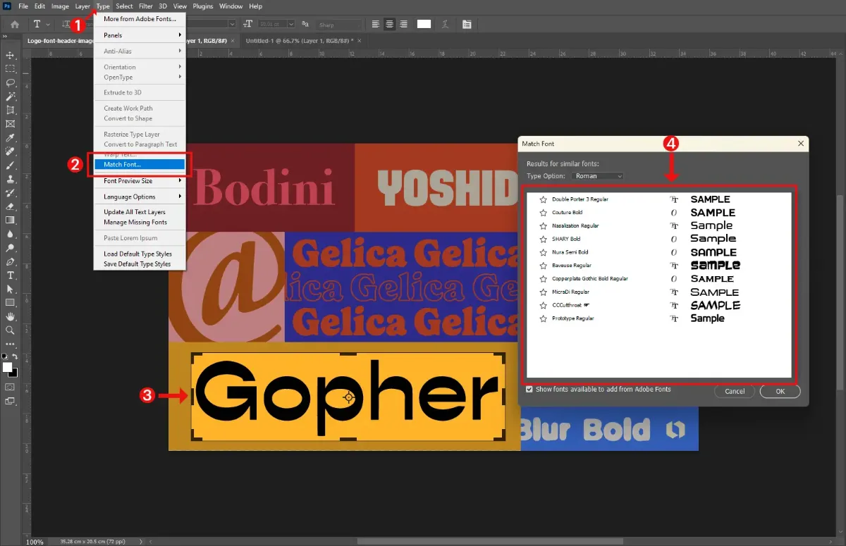 فتوشاپ موارد مشابه و جایگزین را به شما نمایش میدهد که با نوشتههای تصویر انتخابشده مطابقت دارند. اگر پس از امتحانکردن روشهای مختلف، درنهایت موفق نشدهاید به فونت مربوطه برسید، این ابزار نیز تا حدی میتواند به شما کمک کند.