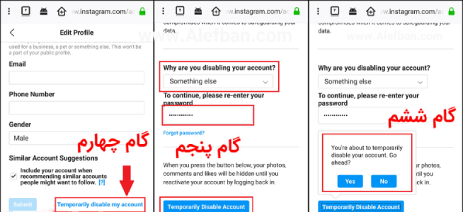 مرحله ششم: وقتی که بر روی گزینه Temporarily Disable Account کلیک کنید، از شما سوال میکند که آیا واقعا میخواهید اکانتتان را دی اکتیو کنید؟ با کلیک بر روی گزینهی Yes اکانتتان غیر فعال میشود.