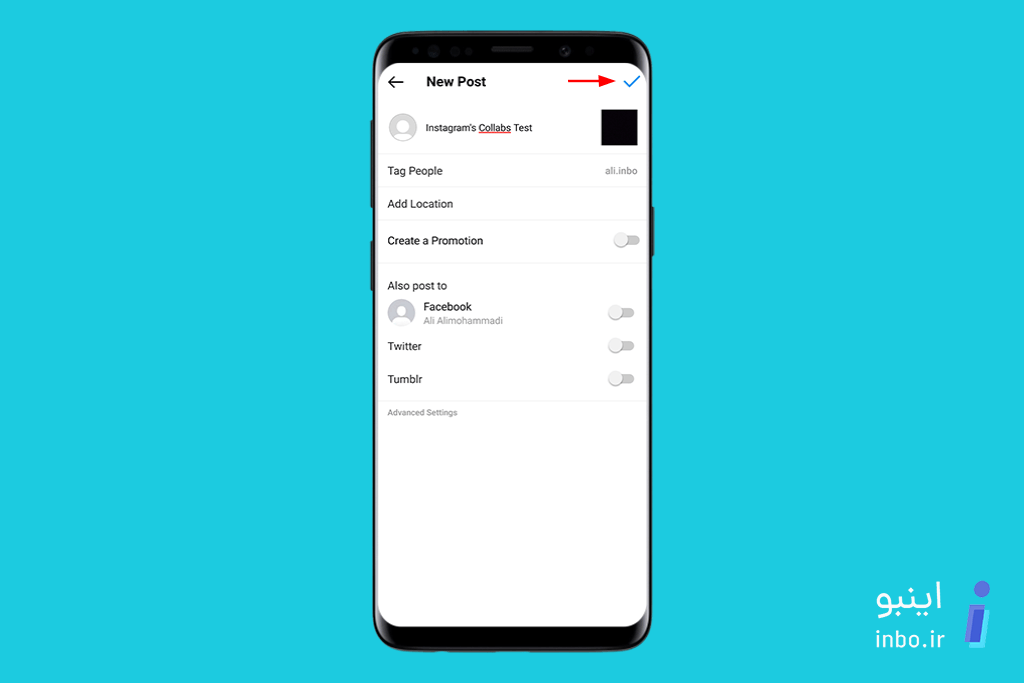 - در صفحهی بعدی، برای انتشار پست دوباره روی آیکون ✔ کلیک کنین.