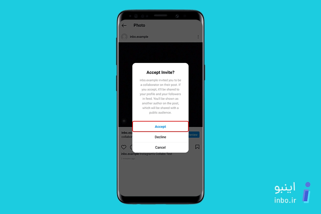- از بین گزینههای نمایش دادهشده، گزینهی Accept رو انتخاب کنین تا پست مشترک برای فالوورهای هر دو پیج نشون داده بشه. به همین راحتی!